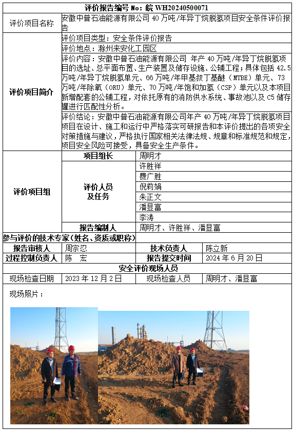 安徽中普石油能源有限公司40萬噸/年異丁烷脫氫項目安全條件評價報告