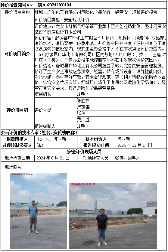 舒城縣廣華化工有限公司危險(xiǎn)化學(xué)品儲(chǔ)存、經(jīng)營(yíng)安全現(xiàn)狀評(píng)價(jià)報(bào)告