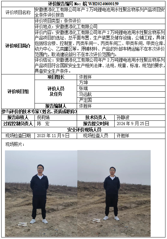 安徽德添化工有限公司年產(chǎn)2萬(wàn)噸鋰電池用水性聚合物系列產(chǎn)品項(xiàng)目安全條件評(píng)價(jià)報(bào)告