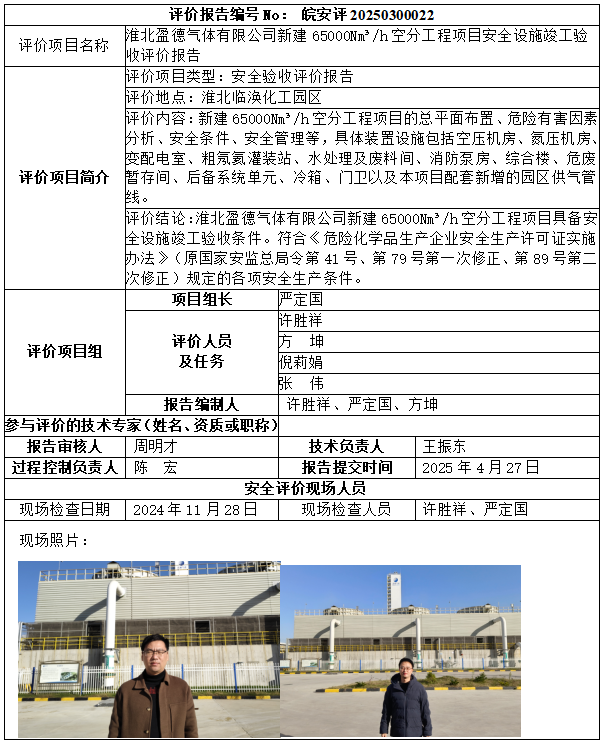 淮北盈德氣體有限公司新建65000Nm3/h空分工程項(xiàng)目安全設(shè)施竣工驗(yàn)收評價報告