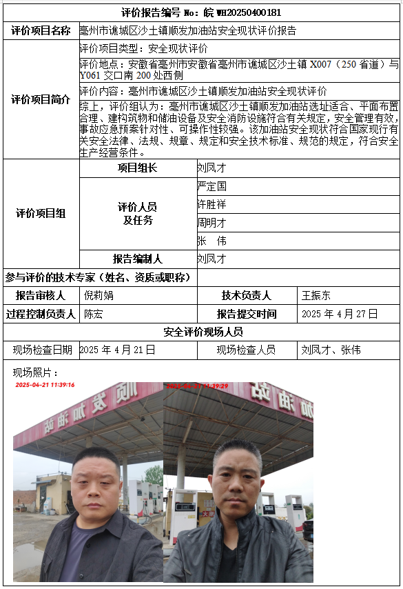 亳州市譙城區(qū)沙土鎮(zhèn)順發(fā)加油站安全現(xiàn)狀評價(jià)報(bào)告