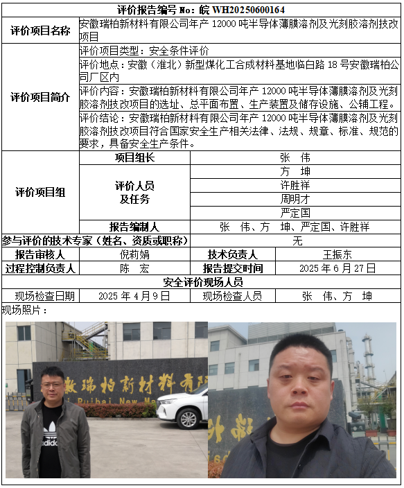 安徽瑞柏新材料有限公司年產(chǎn)12000噸半導(dǎo)體薄膜溶劑及光刻膠溶劑技改項目安全條件評價