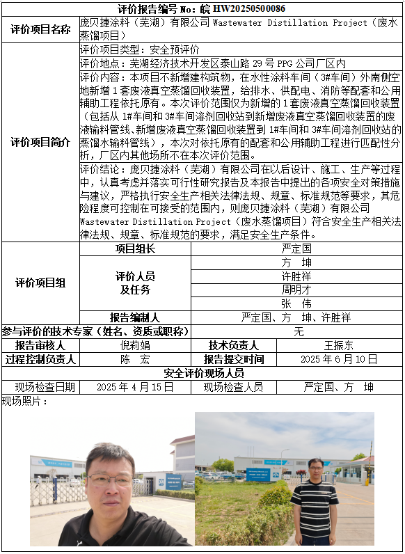 龐貝捷涂料(蕪湖)有限公司W(wǎng)astewater Distillation Project(廢水蒸餾項(xiàng)目)安全預(yù)評(píng)價(jià)