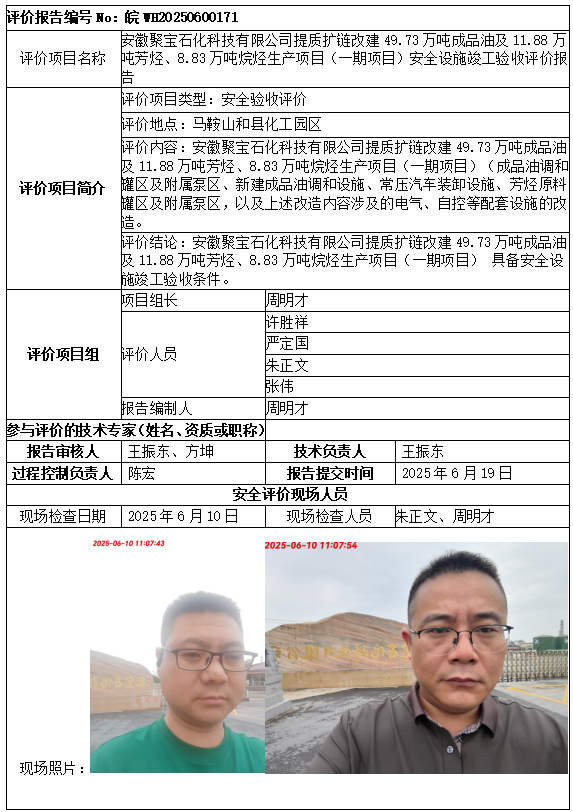 安徽聚寶石化科技有限公司提質(zhì)擴(kuò)鏈改建49.73萬(wàn)噸成品油及11.88萬(wàn)噸芳烴、8.83萬(wàn)噸烷烴生產(chǎn)項(xiàng)目(一期項(xiàng)目)安全設(shè)施竣工驗(yàn)收評(píng)價(jià)報(bào)告