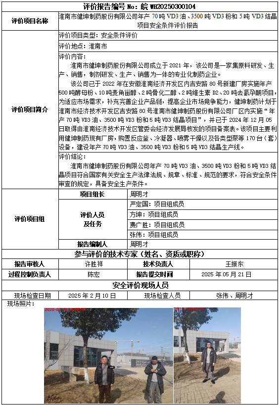 淮南市健坤制藥股份有限公司年產(chǎn)70噸VD3油、3500噸VD3粉和5噸VD3結(jié)晶項(xiàng)目安全條件評(píng)價(jià)報(bào)告