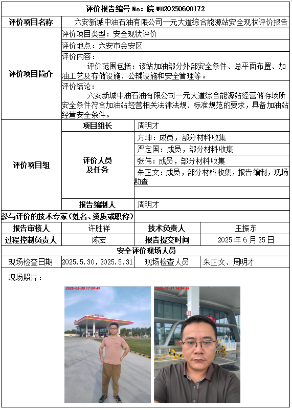 六安新城中油石油有限公司一元大道綜合能源站安全現(xiàn)狀評價(jià)報(bào)告