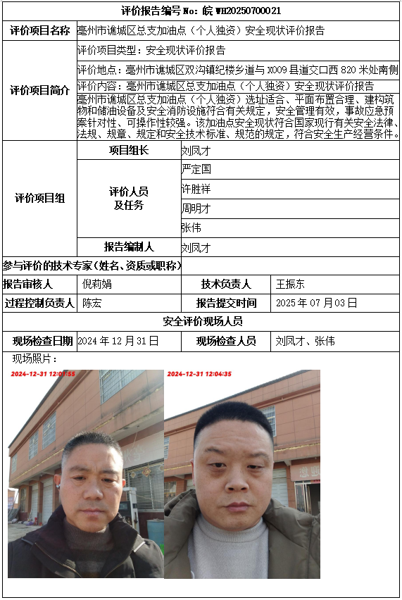 亳州市譙城區(qū)總支加油點(個人獨資)安全現(xiàn)狀評價報告