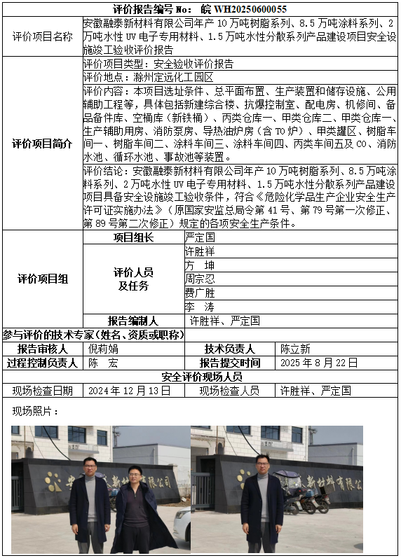 安徽融泰新材料有限公司年產10萬噸樹脂系列、8.5萬噸涂料系列、2萬噸水性UV電子專用材料、1.5萬噸水性分散系列產品建設項目安全設施竣工驗收評價報告