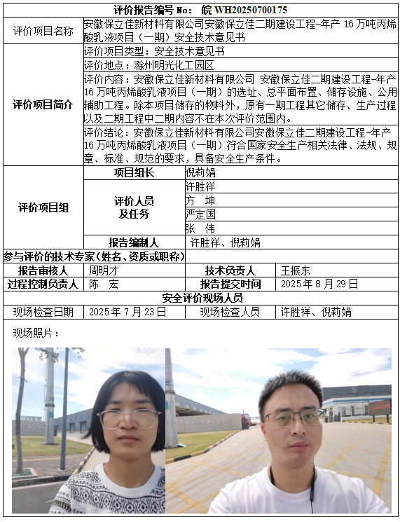 安徽保立佳新材料有限公司安徽保立佳二期建設(shè)工程-年產(chǎn)16萬噸丙烯酸乳液項目(一期)安全技術(shù)意見書