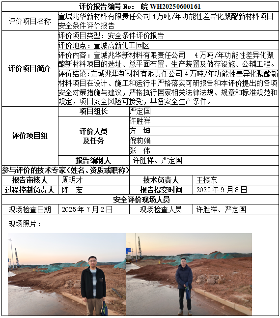 宣城兆華新材料有限責(zé)任公司4萬噸/年功能性差異化聚酯新材料項(xiàng)目 安全條件評價(jià)報(bào)告
