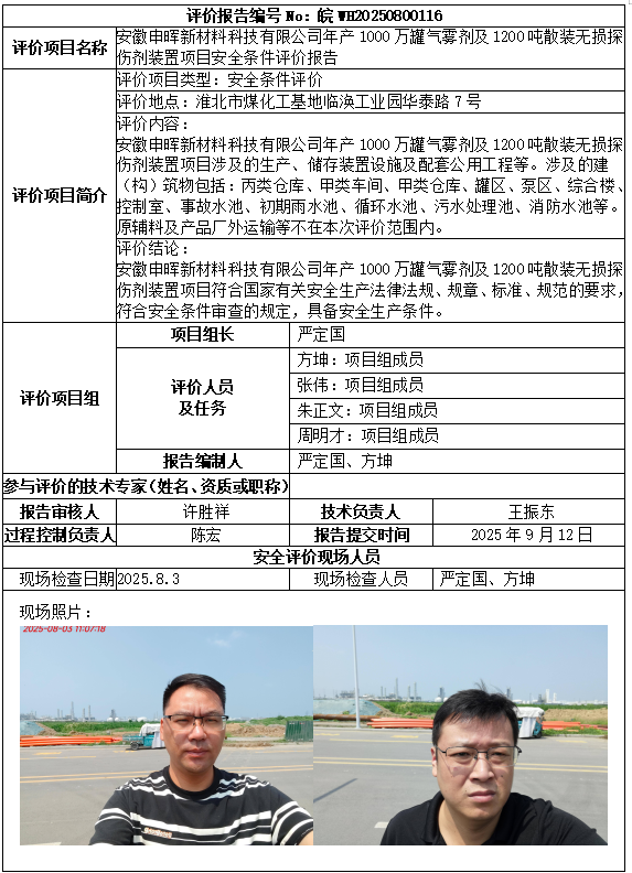 安徽申暉新材料科技有限公司年產(chǎn)1000萬罐氣霧劑及1200噸散裝無損探傷劑裝置項目安全條件評價報告