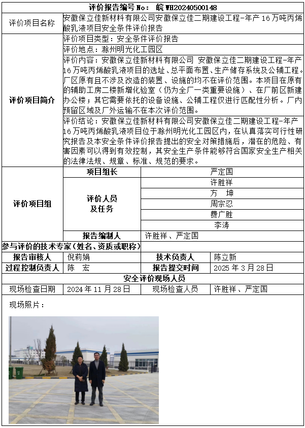 安徽保立佳新材料有限公司安徽保立佳二期建設(shè)工程-年產(chǎn)16萬噸丙烯酸乳液項目安全條件評價報告