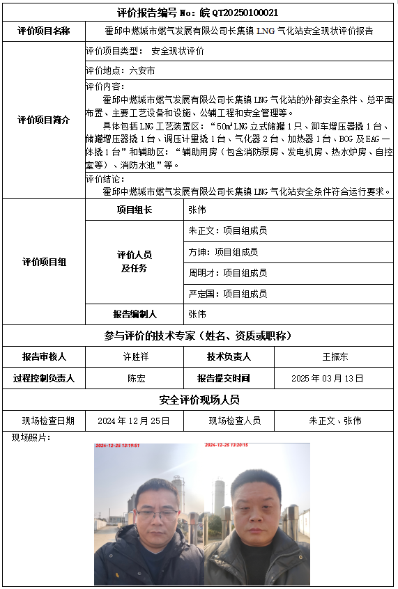 霍邱中燃城市燃?xì)獍l(fā)展有限公司長集鎮(zhèn)LNG氣化站安全現(xiàn)狀評價報告