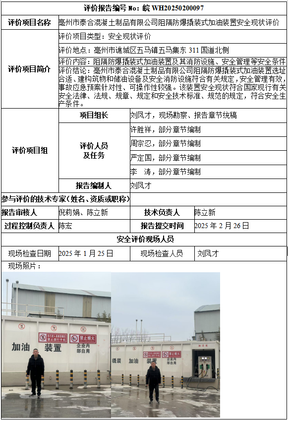 亳州市泰合混凝土制品有限公司阻隔防爆撬裝式加油裝置安全現(xiàn)狀評價(jià)