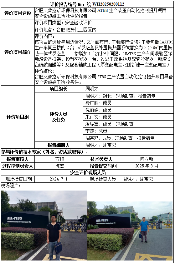 合肥艾普拉斯環(huán)??萍加邢薰続TBS生產(chǎn)裝置自動(dòng)化控制提升項(xiàng)目 安全設(shè)施竣工驗(yàn)收評(píng)價(jià)報(bào)告
