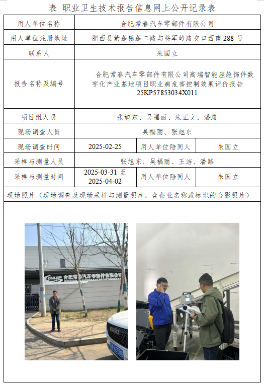 合肥常春汽車零部件有限公司高端智能座艙飾件數(shù)字化產(chǎn)業(yè)基地項目職業(yè)病危害控制效果評價報告
