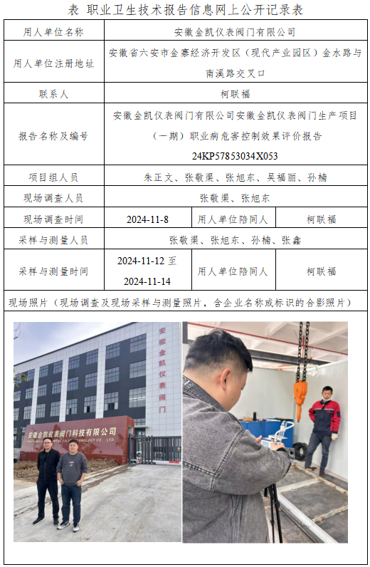 安徽金凱儀表閥門有限公司安徽金凱儀表閥門生產(chǎn)項(xiàng)目(一期)職業(yè)病危害控制效果評價報告