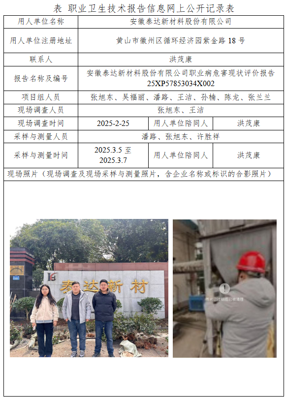 安徽泰達(dá)新材料股份有限公司職業(yè)病危害現(xiàn)狀評價(jià)報(bào)告