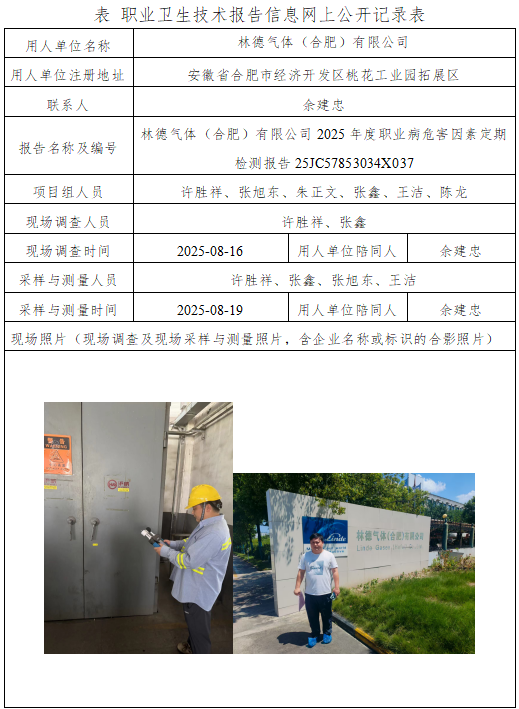 林德氣體(合肥)有限公司2025年度職業(yè)病危害因素定期檢測報告