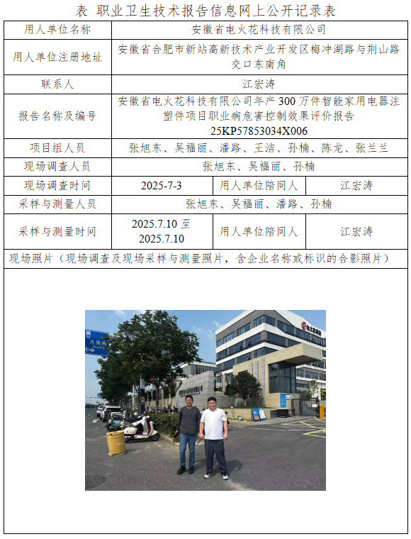 安徽省電火花科技有限公司年產300萬件智能家用電器注塑件項目職業(yè)病危害控制效果評價報告