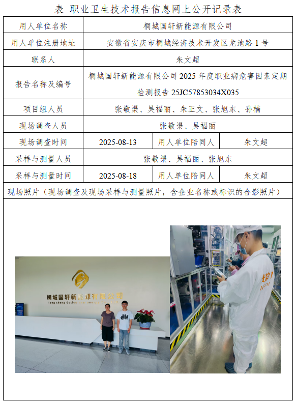 桐城國軒新能源有限公司2025年度職業(yè)病危害因素定期檢測報告