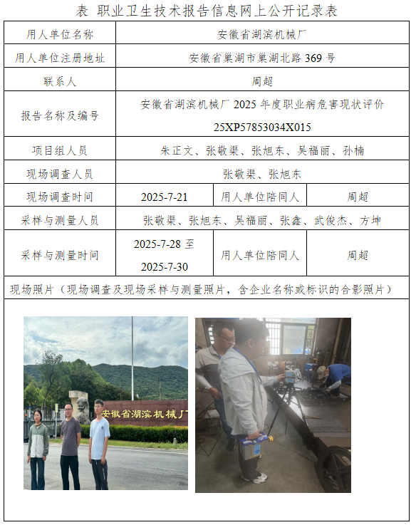 安徽省湖濱機(jī)械廠2025年度職業(yè)病危害現(xiàn)狀評價報告