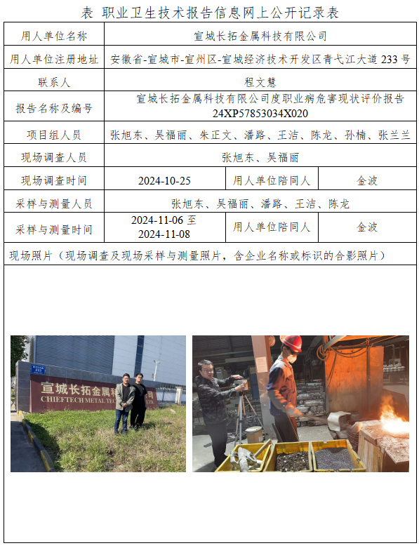 宣城長拓金屬科技有限公司度職業(yè)病危害現(xiàn)狀評價(jià)報(bào)告