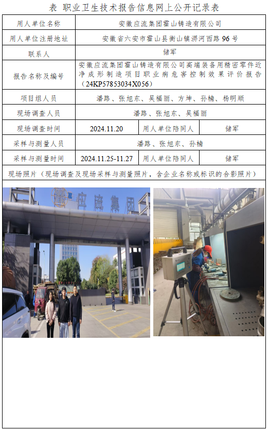 安徽應流集團霍山鑄造有限公司高端裝備用精密零件近凈成形制造項目職業(yè)病危害控制效果評價報告