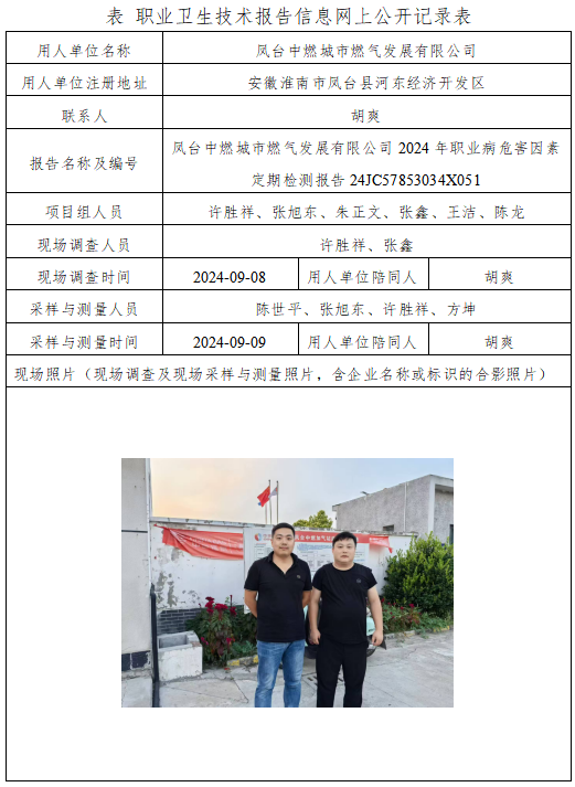 鳳臺(tái)中燃城市燃?xì)獍l(fā)展有限公司2024年職業(yè)病危害因素定期檢測報(bào)告