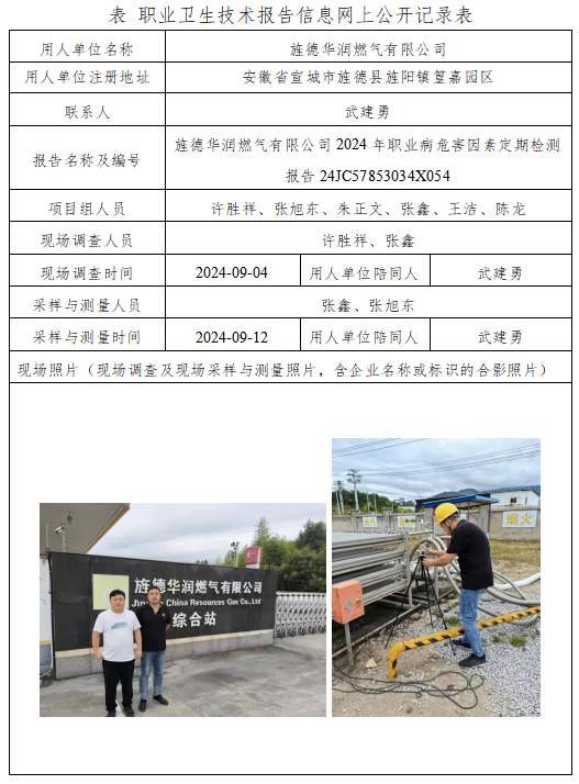 旌德華潤(rùn)燃?xì)庥邢薰?024年職業(yè)病危害因素定期檢測(cè)報(bào)告