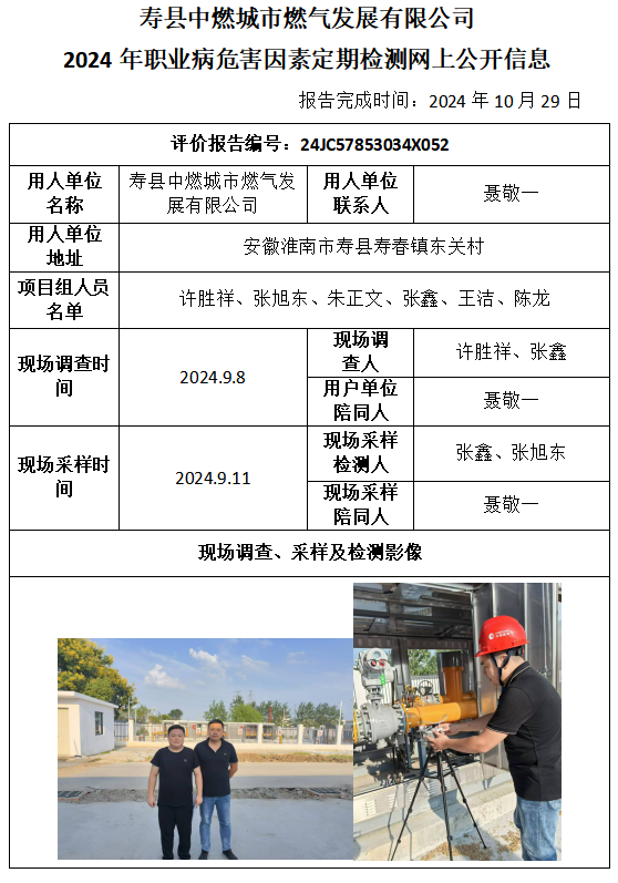 壽縣中燃城市燃?xì)獍l(fā)展有限公司 2024年職業(yè)病危害因素定期檢測報告
