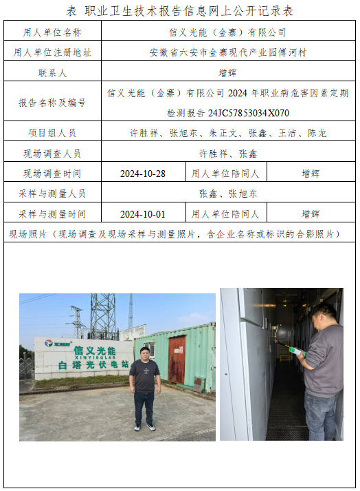 信義光能(金寨)有限公司2024年職業(yè)病危害因素定期檢測報告