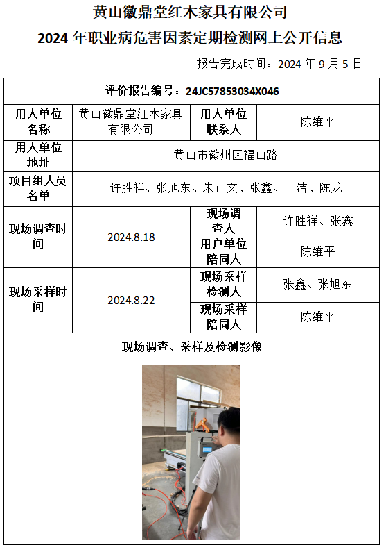 黃山徽鼎堂紅木家具有限公司 2024年職業(yè)病危害因素定期檢測