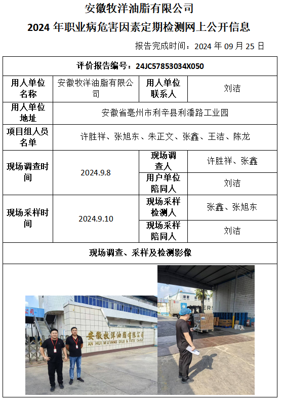 安徽牧洋油脂有限公司 2024年職業(yè)病危害因素定期檢測(cè)